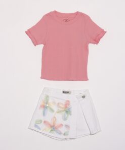 Kız Çocuk Pembe Fitilli Tişört ve Çiçek Desenli Denim Etek Takım