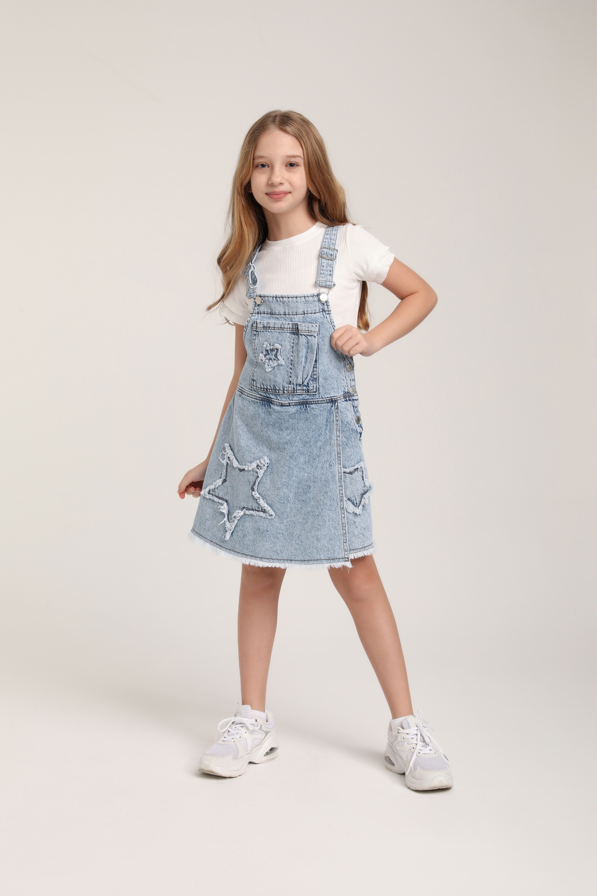 Minik hanımefendiler için hem şık hem de rahat bir seçenek! Bu mavi yıkamalı kot salopet elbise, günlük kullanıma veya özel günlerde rahatlıkla tercih edilebilir. Yıkamalı deseni ve yıldız detayları ile modern bir görünüm sunarken, kot kumaşı ile de rahat bir stil sergiler. Yüksek kaliteli denim kumaşı sayesinde gün boyu konforlu ve hareket özgürlüğü sağlar.